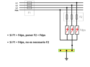 Vamos a referirnos al «Back Up Fuse» con las siglas Fdps. De acuerdo al gráfico, si el DPS se instala en un sistema donde los fusibles aguas arriba F1 son mayores que la capacidad Fdps que soporta el DPS, es necesario usar Fusibles F2 previos para la protección del DPS. Si por el contrario, F1 es menor que la capacidad de sobrecorriente que soporta el DPS, no es necesario.