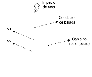 La corriente de rayo puede inducir sobretensiones en todos los bucles de conductores cercanos. Inclusive, se pueden inducir diferencias de tensión en el mismo conductor de bajada del apantallamiento. Como los rayos se componen de un impacto principal con una serie de impactos sucesivos, los voltaje V1 y V2 van a ser de diferentes magnitudes en el mismo instante de tiempo, generando una diferencia de tensión que en algunos casos puede generar un arco eléctrico.